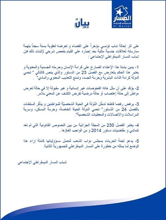 Suite à la condamnation, le 22 septembre 2015, d’un jeune Tunisien de 22 ans à un an de prison