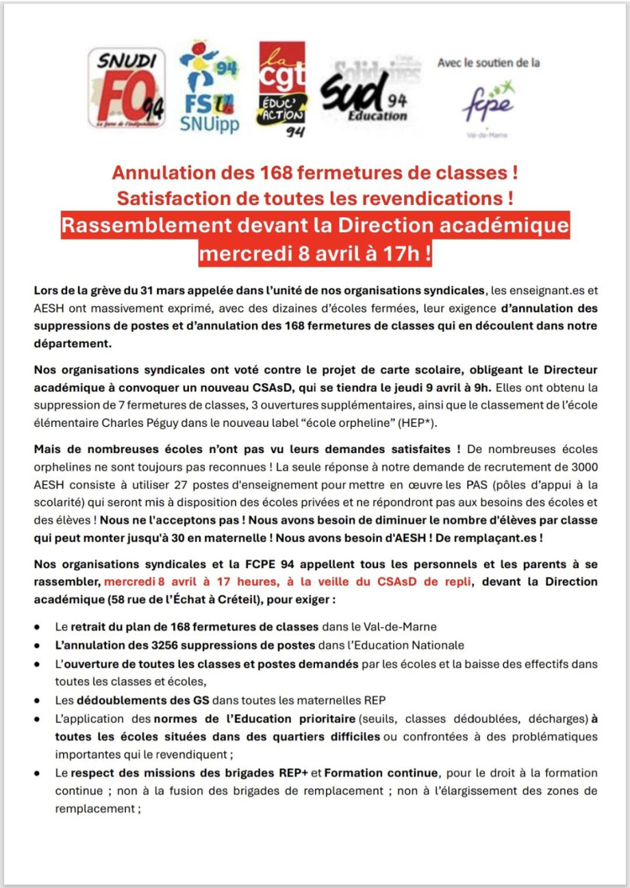 La fcpe vous invite soit à vous rendre à Créteil et participer au rassemblement soit signer la pétition d'ici mercredi midi pour soutenir celles et ceux d'entre nous qui iront.